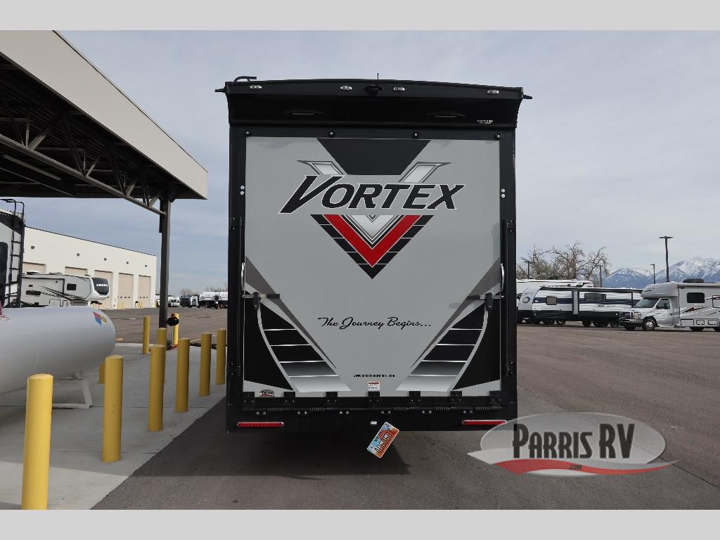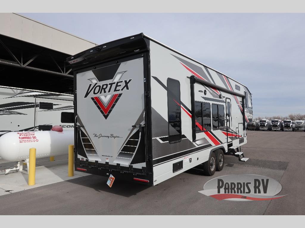 If you want to get away for the weekend with your toys, get away with this Vortex toy hauler. It has a 16' 4" garage to keep your ATVs and dirt bikes secure while you travel. You can accommodate a group of six for sleeping with the king-size bed, power queen bunk and sofas, and everyone will benefit from a hot meal prepared on the three-burner range in the kitchen. You can even keep your cold items fresh by storing them in the refrigerator. The dual-entry bathroom has a door within the main hallway, but it also has a private entrance that leads into the bedroom.