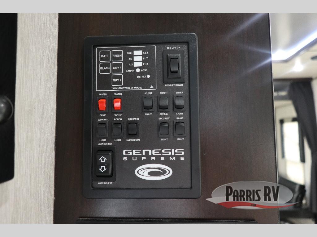 Your camping life is going to be a blast with the Genesis Supreme Vortex toy hauler! These work horses get the job done but also make it fun. You will be able to use the 40-gallon fuel station to gas up your toys when you come back from the trails, and the power awning with LED lights will give you protection as you use the exterior features. The 16" deluxe aluminum alloy wheels will get you to and from your destination with confidence, and the 30,000 or 35,000 BTU furnace will ensure that you don't freeze while you sleep on cool nights. You can keep power flowing with the 4.0kW generator with transfer switch, and you'll also enjoy the function and the style of the solid-surface countertops in the kitchen.
