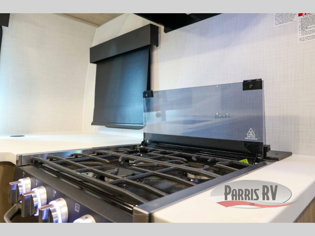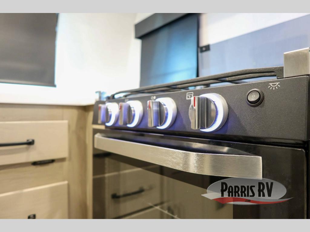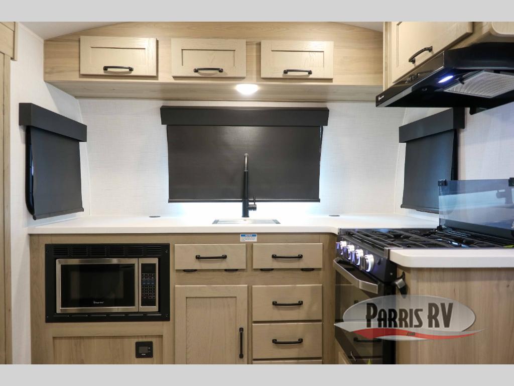 Are you looking for a lightweight trailer with at-home comforts? Take a look at this single slide out unit that can sleep three to four each night. There is a queen-size bed in the back with a 26" x 80" flip-up bunk for cozy sleeping space, a 72" sofa with cupholders to relax on, plus a 32" 12V TV for movie nights! The front kitchen includes a 12V refrigerator to store food, plus a microwave oven and a gas oven to cook meals each day.